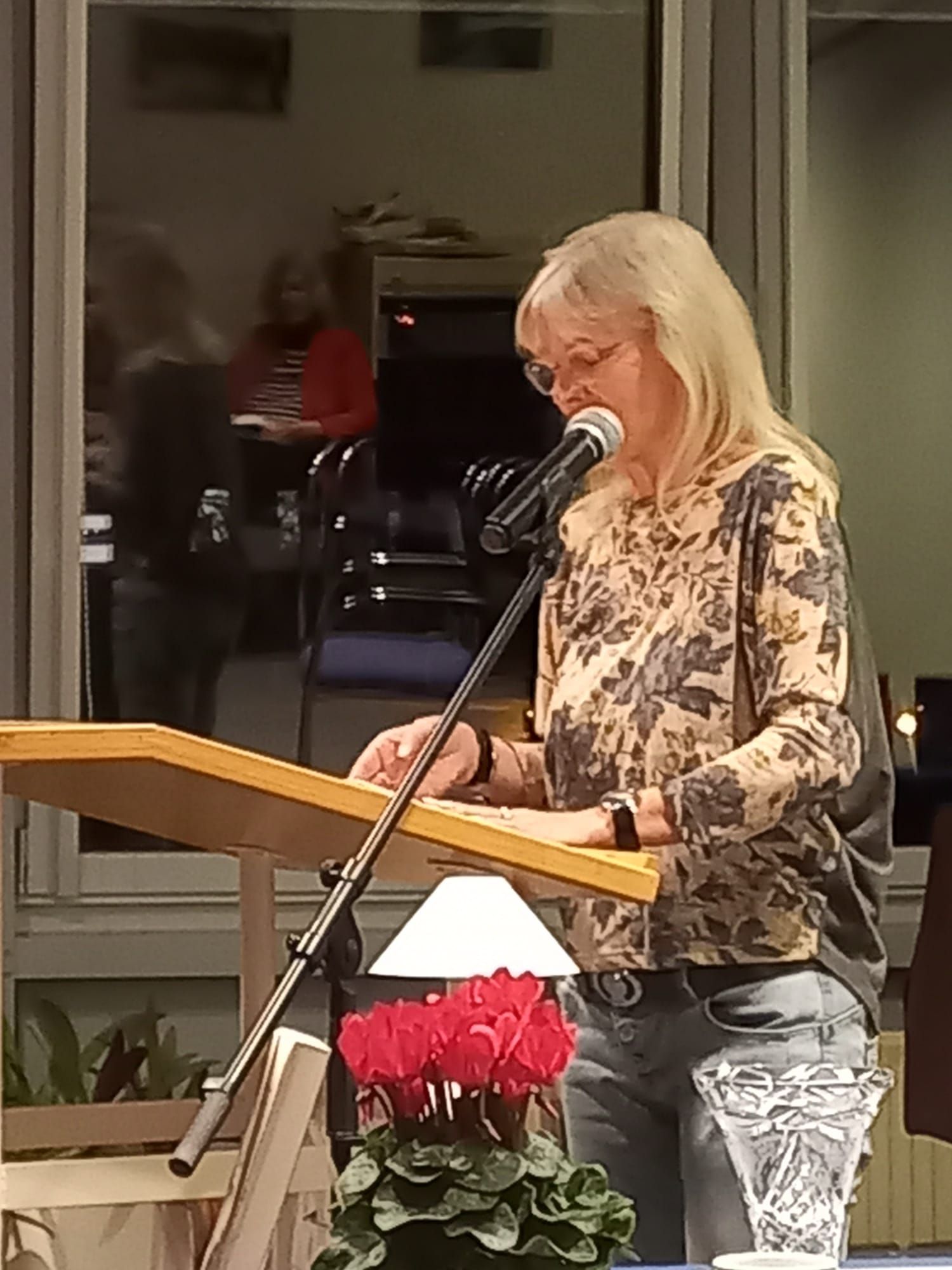Richtig schön war’s! Ina Jäkel und das Team von der Stadtbibliothek haben eine wunderbare Atmosphäre gezaubert: Stühle um kleine Tische gruppiert, auf den Tischen weihnachtliches Gebäck und Deko, dazu gedämpftes Licht wie Kerzenschimmer, am Ausschank gab es Heißgetränke und erstmals einen (alkoholfreien) Apfelpunsch ... Wir haben uns bei einer Lesung selten so wohlgefühlt und starteten ganz entspannt.