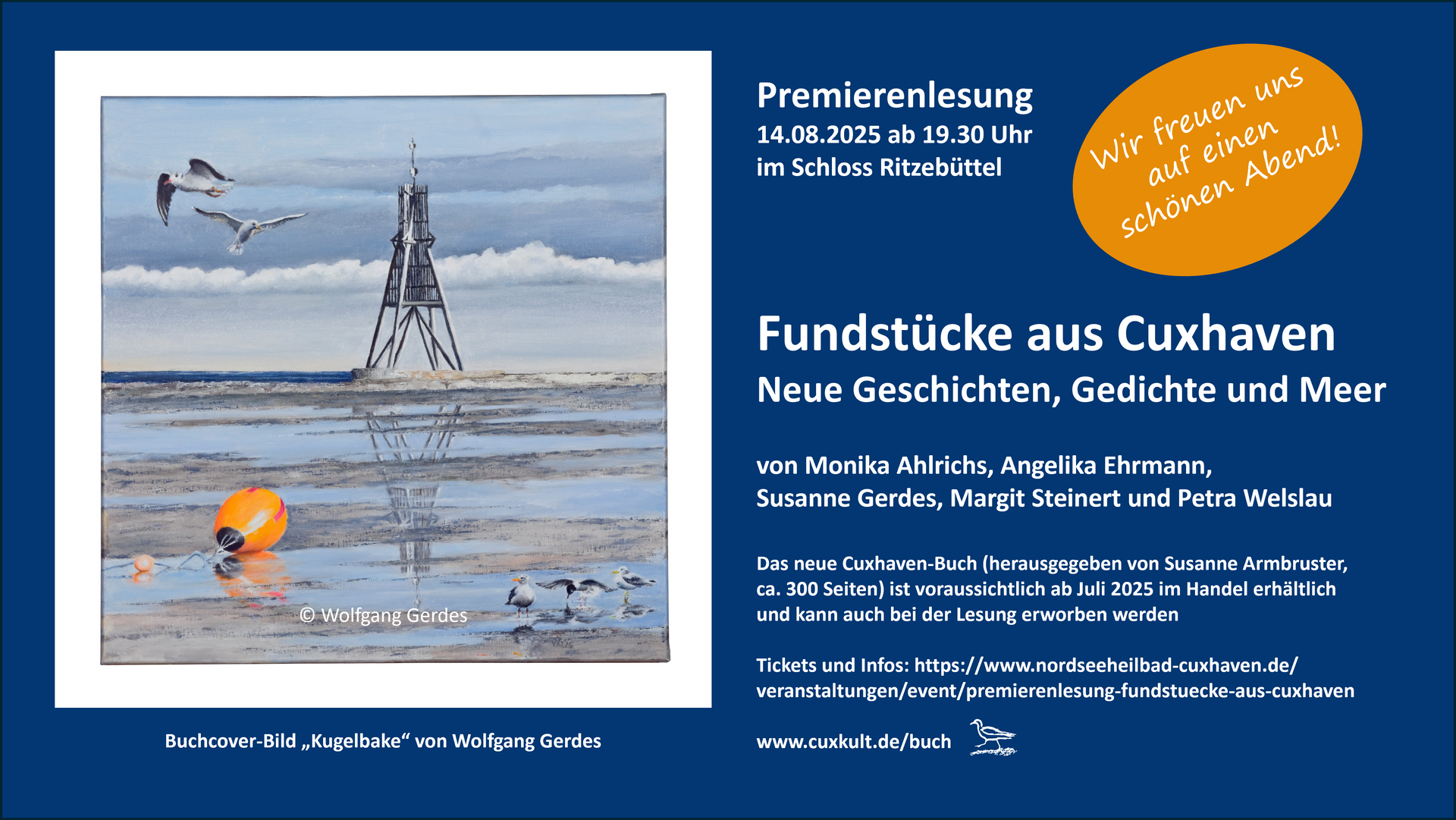 „Fundstücke aus Cuxhaven. Neue Geschichten, Gedichte und Meer“ erscheint voraussichtlich im Juli 2025 als Taschenbuch, ca. 300 Seiten. Auf dem Cover ein Gemälde von Wolfgang Gerdes mit dem Wahrzeichen der Stadt.