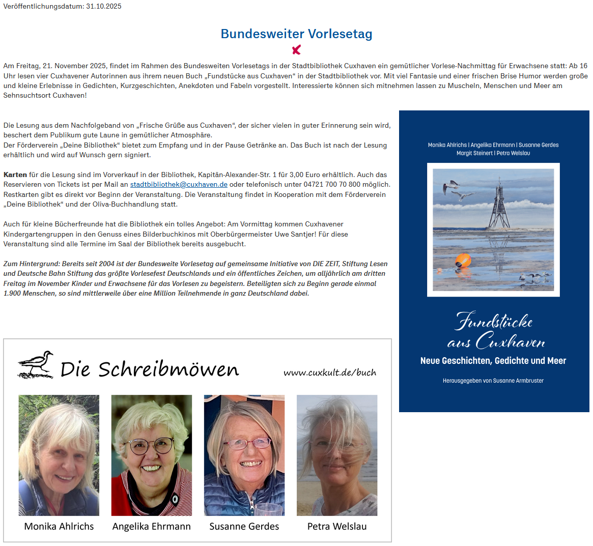 - Stadt Cuxhaven, „Flaschenpost“ vom 31.10.2025: „Bundesweiter Vorlesetag“ in der Stadtbibliothek Cuxhaven. Homepage der Stadt Cuxhaven. URL: https://www.cuxhaven.de/aktuelle-nachrichten/flaschenpost/flaschenpost-1/fundstuecke-aus-cuxhaven-am-vorlesetag-in-der-stadtbibliothek.html [letzter Aufruf: 16.11.2025].