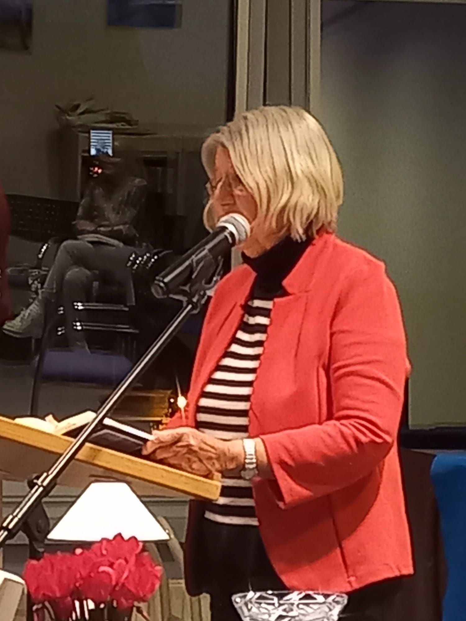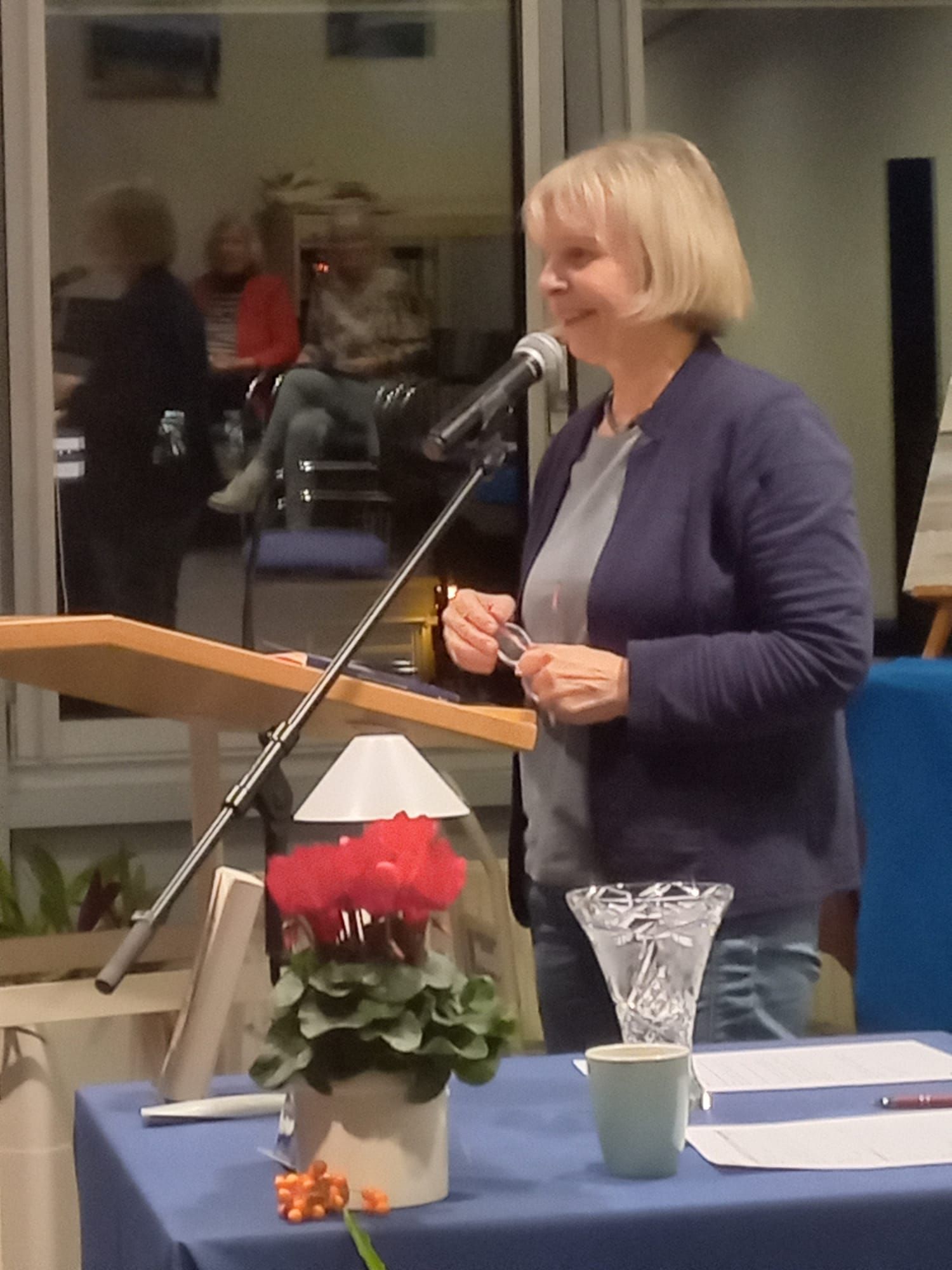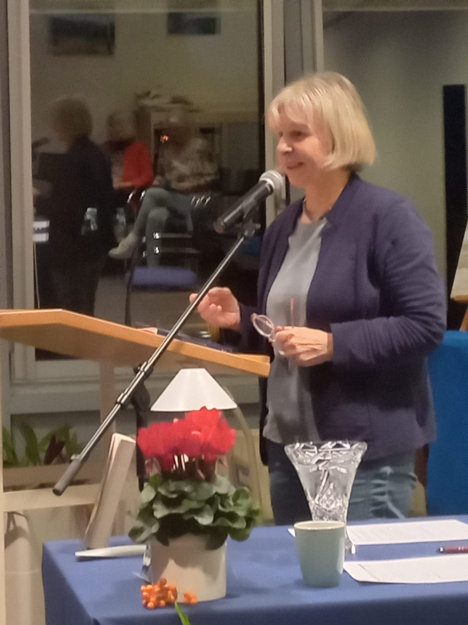 Richtig schön war’s! Ina Jäkel und das Team von der Stadtbibliothek haben eine wunderbare Atmosphäre gezaubert: Stühle um kleine Tische gruppiert, auf den Tischen weihnachtliches Gebäck und Deko, dazu gedämpftes Licht wie Kerzenschimmer, am Ausschank gab es Heißgetränke und erstmals einen (alkoholfreien) Apfelpunsch ... Wir haben uns bei einer Lesung selten so wohlgefühlt und starteten ganz entspannt.