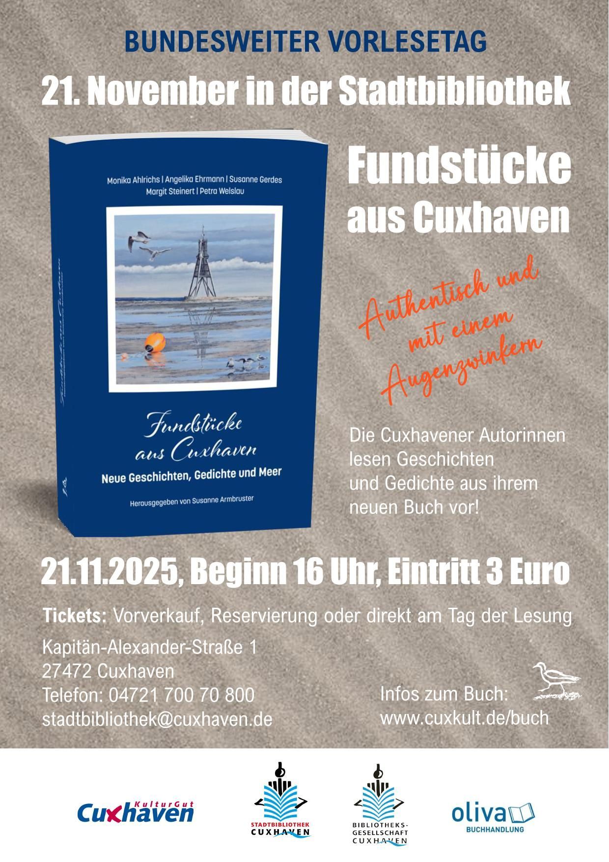 Ein Highlight war der Gastbeitrag von Stephanie Lüder, Leiterin der Stadtbibliothek und des Stadtarchivs. Aus ihrem eigenen Buchprojekt las sie: „Was wäre, wenn … Cuxhaven eine Bibliothek am Strand hätte?“ (zu finden auch in „Fundstücke aus Cuxhaven“). Wir sind gespannt auf die Fortsetzung!
